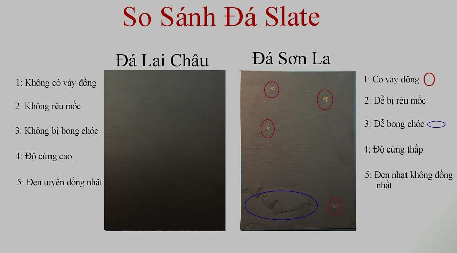 + Ngược lại với đá Slate Sơn La màu sắc đen nhạt không đồng đều, lẫn tạp chất đồng, sau một thời gian ngắn các chấm đồng trên đá sẽ bị oxi hóa chuyển sang màu xanh rêu rất mất thẩm mỹ.